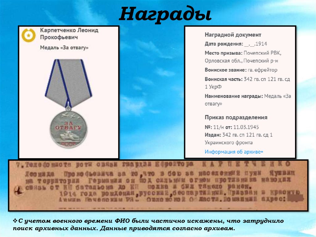 НаградыС учетом военного времени ФИО были частично искажены, что затруднило