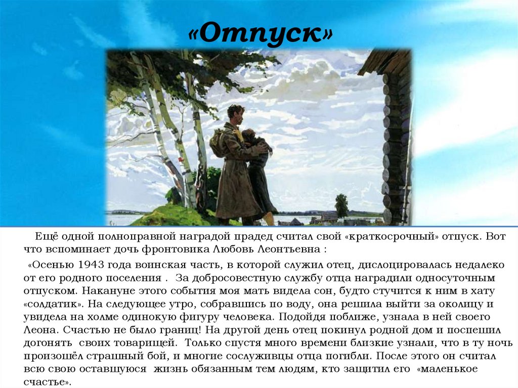 «Отпуск»Ещё одной полноправной наградой прадед считал свой «краткосрочный» отпуск. Вот