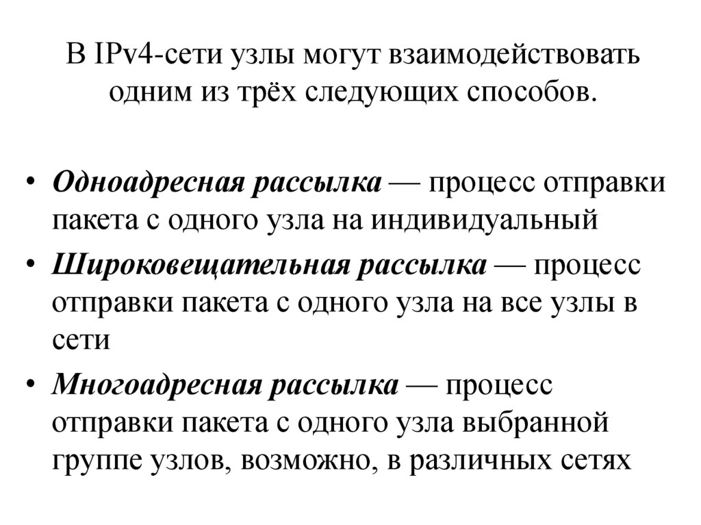 В IPv4-сети узлы могут взаимодействоватьодним из трёх следующих способов.