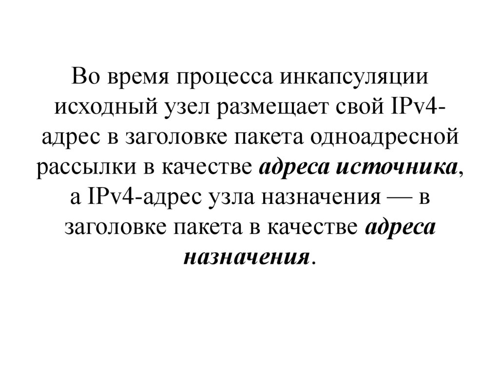 Во время процесса инкапсуляцииисходный узел размещает свой IPv4адрес в заголовке пакета одноадресной