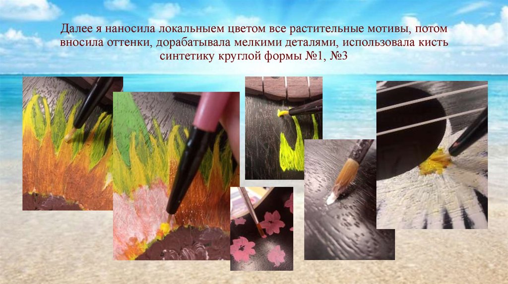 Далее я наносила локальныем цветом все растительные мотивы, потомвносила оттенки, дорабатывала мелкими деталями, использовала кисть