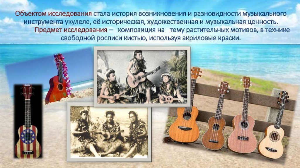 Объектом исследования стала история возникновения и разновидности музыкальногоинструмента укулеле, её историческая, художественная и музыкальная ценность.