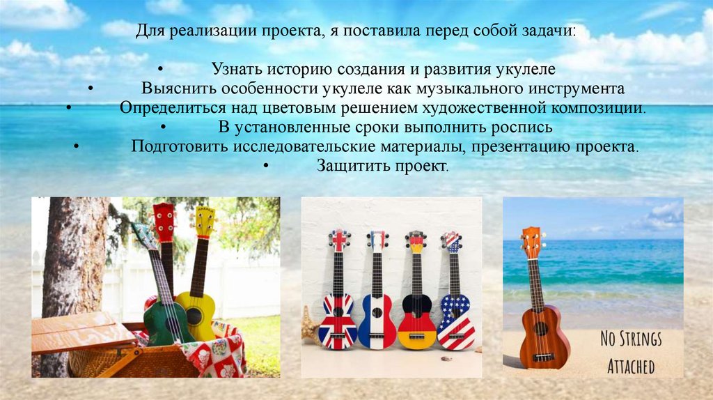 Для реализации проекта, я поставила перед собой задачи:Узнать историю создания и развития укулеле
