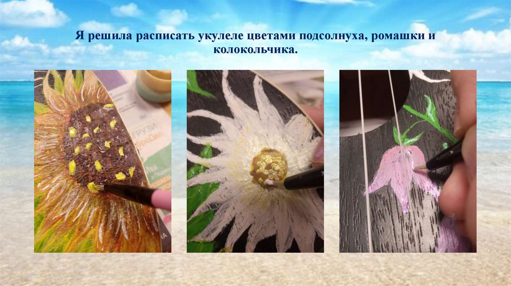 Я решила расписать укулеле цветами подсолнуха, ромашки иколокольчика.