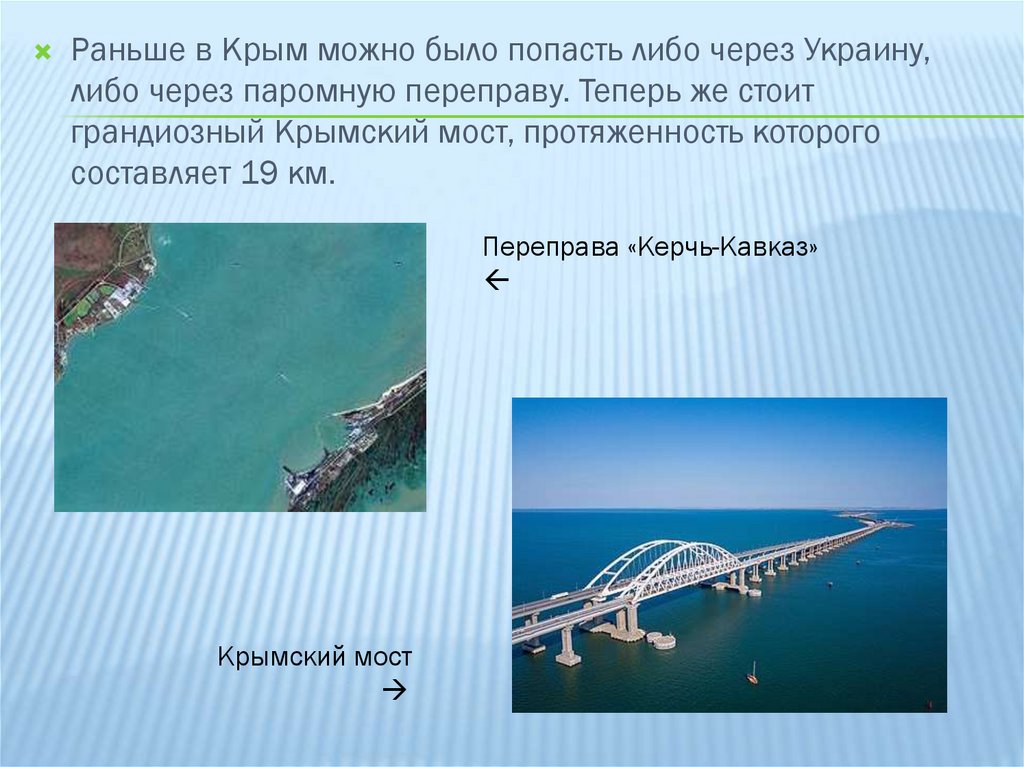 Раньше в Крым можно было попасть либо через Украину,либо через паромную переправу. Теперь же стоит