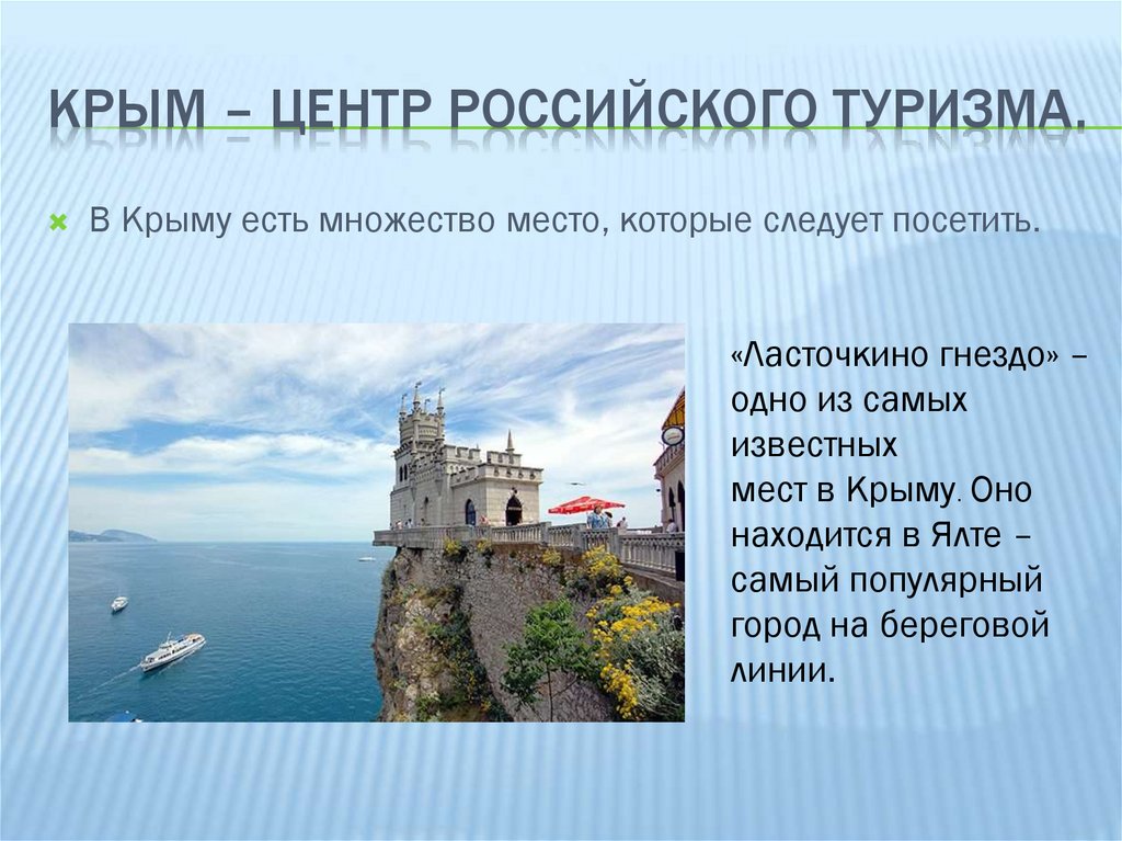 КРЫМ – ЦЕНТР РОССИЙСКОГО ТУРИЗМА.В Крыму есть множество место, которые следует посетить.