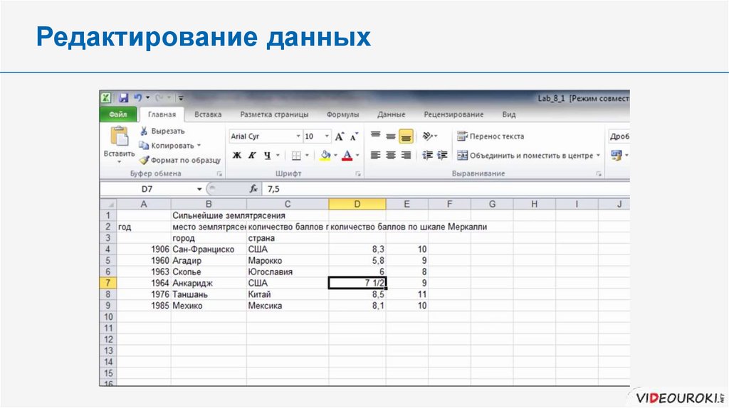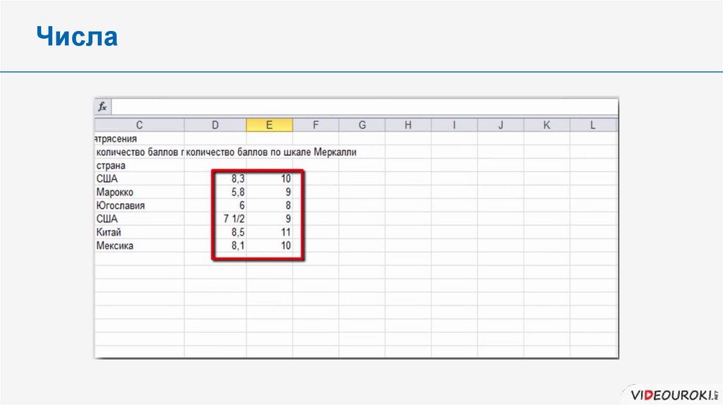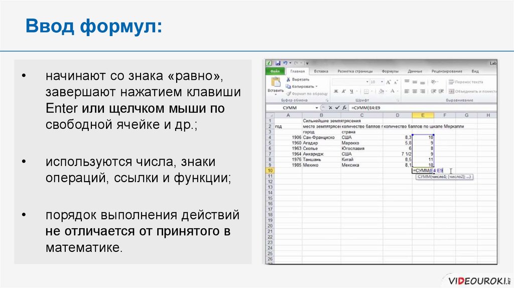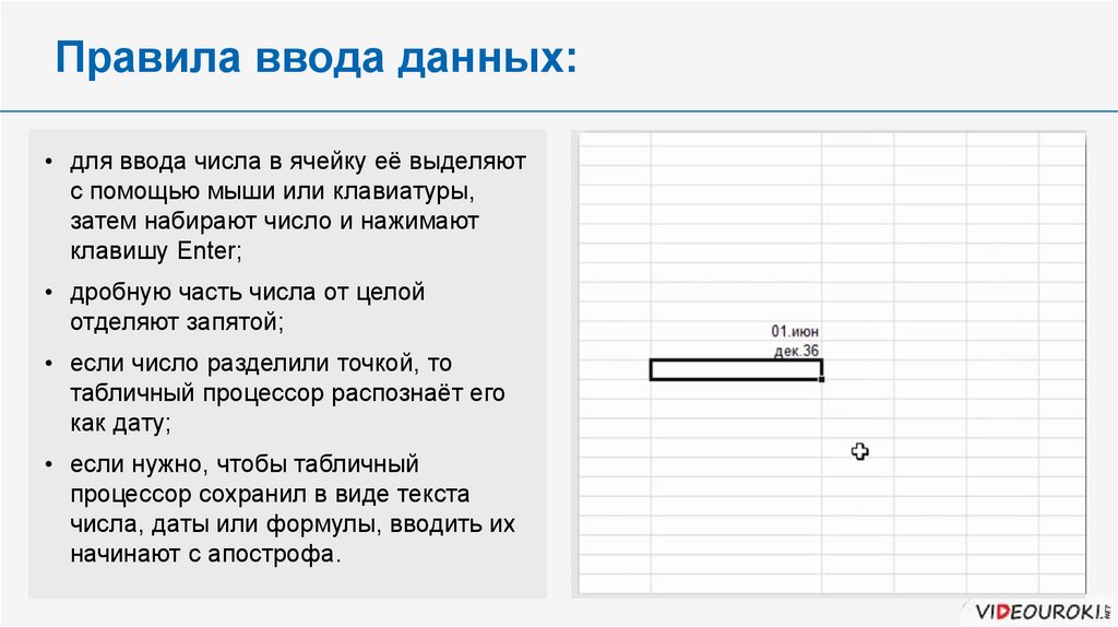 Правила ввода данных:• для ввода числа в ячейку её выделяют