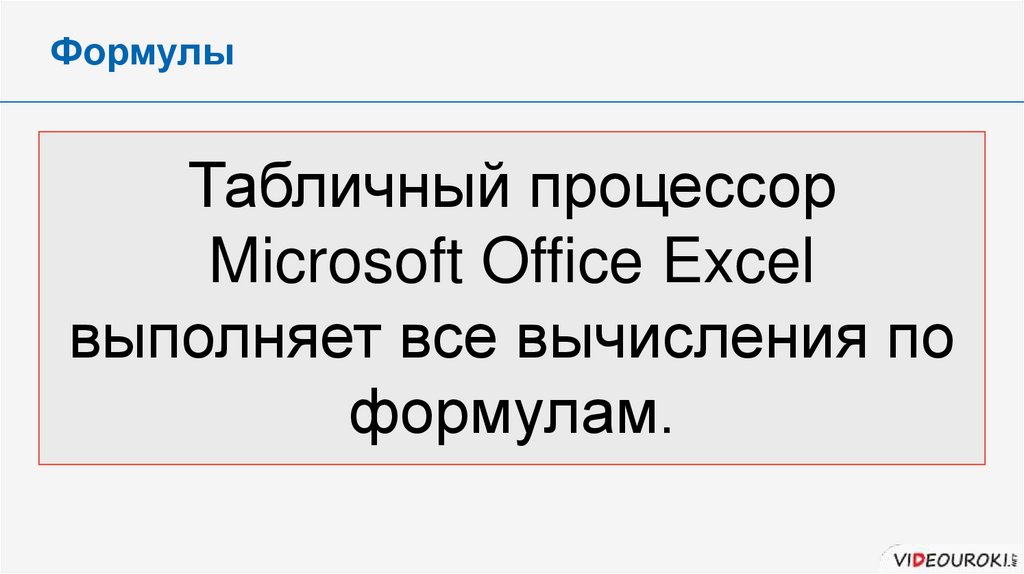Табличный процессор выполняет все вычисления по формулам. В состав формул могут входить