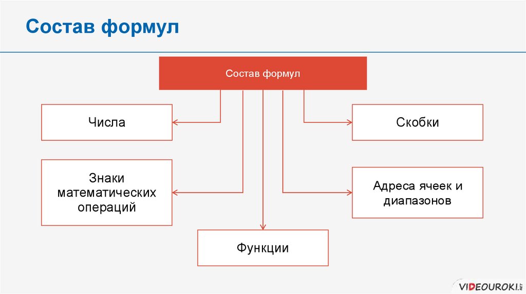 числа, знаки математических операций, скобки, адреса ячеек и диапазонов, а также функции.