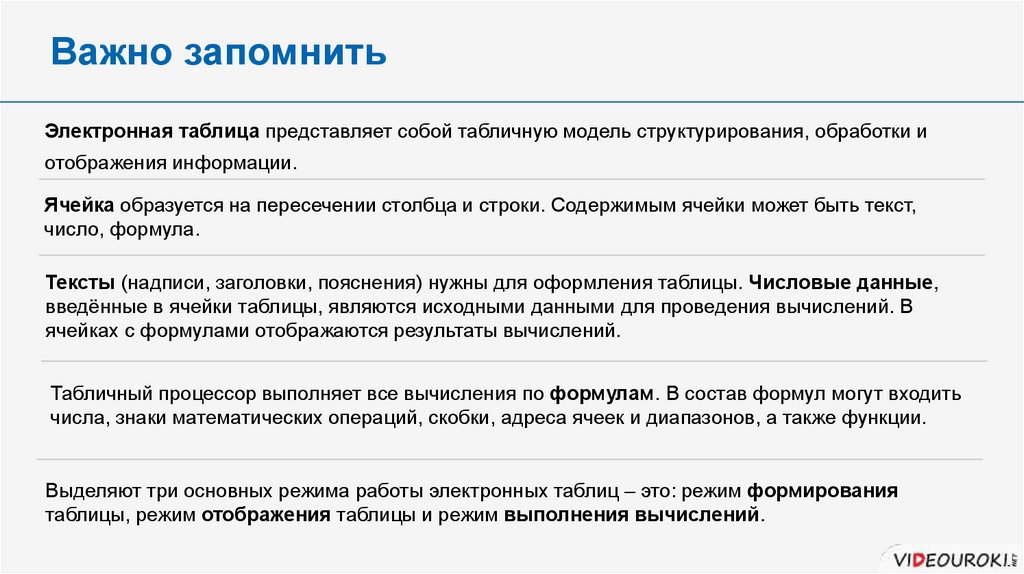 Важно запомнитьЭлектронная таблица представляет собой табличную модель структурирования, обработки и