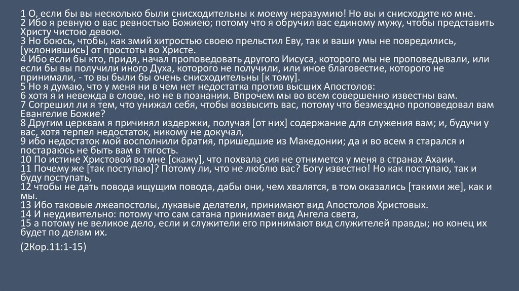 1 О, если бы вы несколько были снисходительны к моему неразумию! Но вы и снисходите ко мне.2 Ибо я ревную о вас ревностью Божиею; потому что я обручил вас единому мужу, чтобы представить