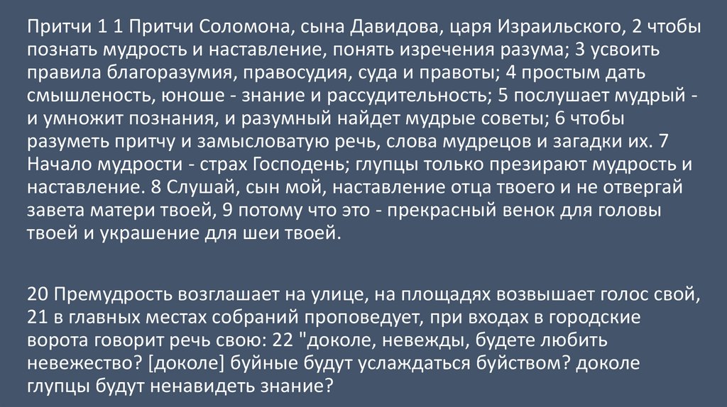 Притчи 1 1 Притчи Соломона, сына Давидова, царя Израильского, 2 чтобыпознать мудрость и наставление, понять изречения разума; 3 усвоить