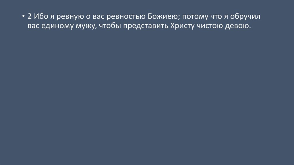 • 2 Ибо я ревную о вас ревностью Божиею; потому что я обручилвас единому мужу, чтобы представить Христу чистою девою.