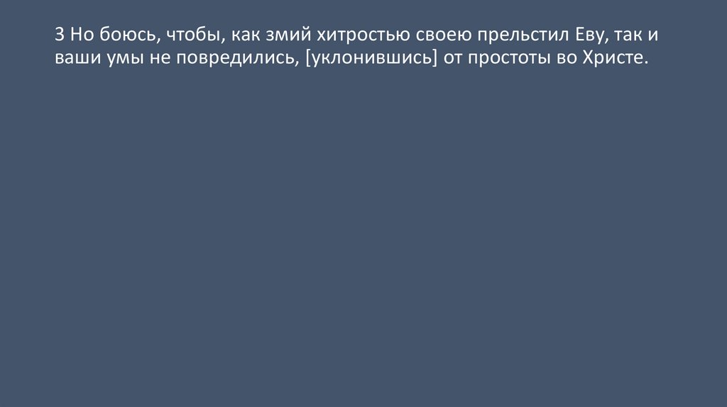 3 Но боюсь, чтобы, как змий хитростью своею прельстил Еву, так иваши умы не повредились, [уклонившись] от простоты во Христе.