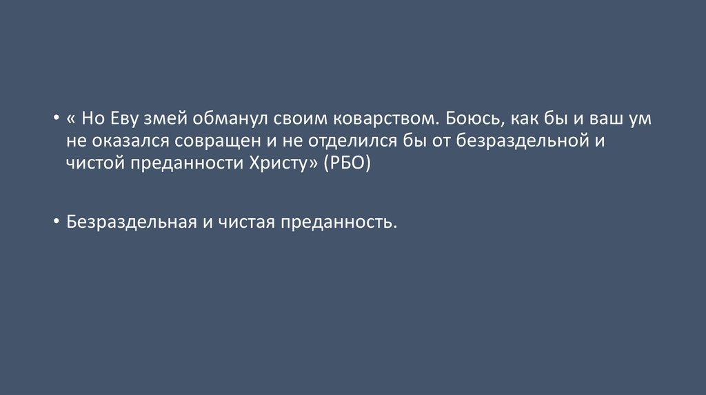 • « Но Еву змей обманул своим коварством. Боюсь, как бы и ваш умне оказался совращен и не отделился бы от безраздельной и