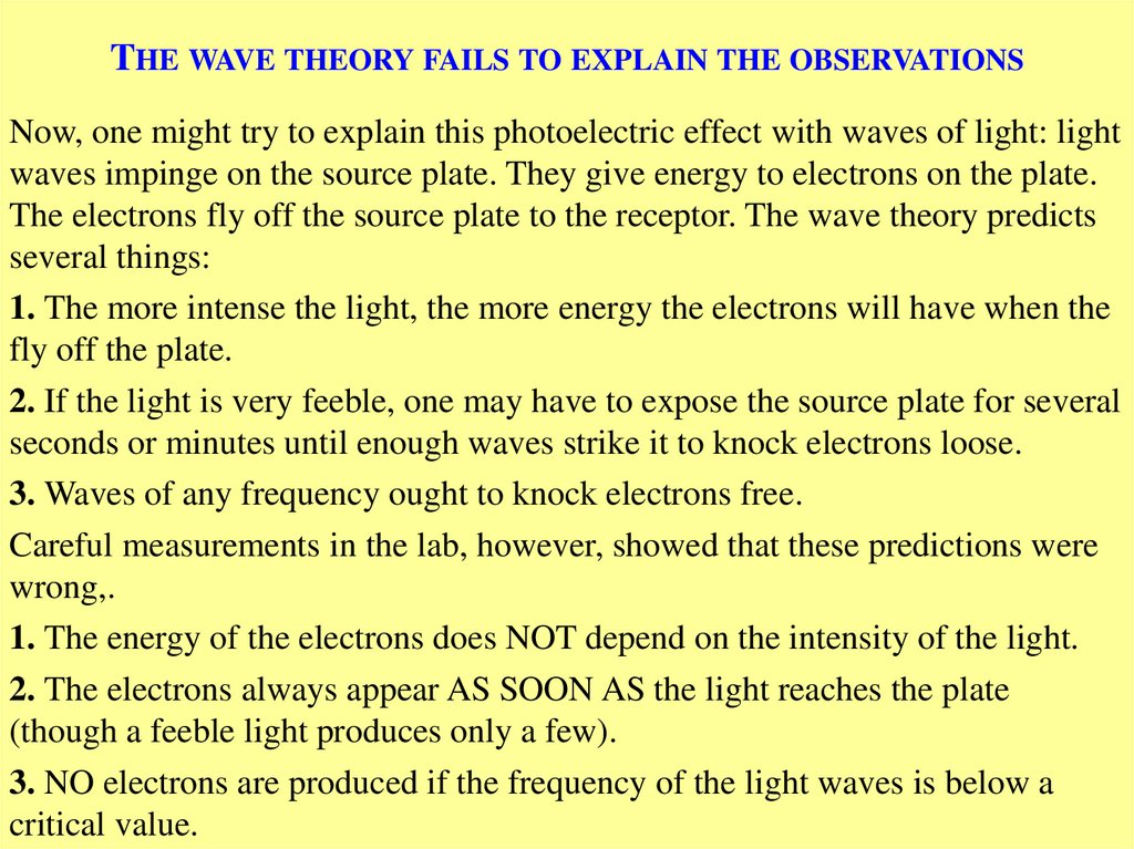 THE WAVE THEORY FAILS TO EXPLAIN THE OBSERVATIONSNow, one might try to explain this photoelectric effect with waves of light: light