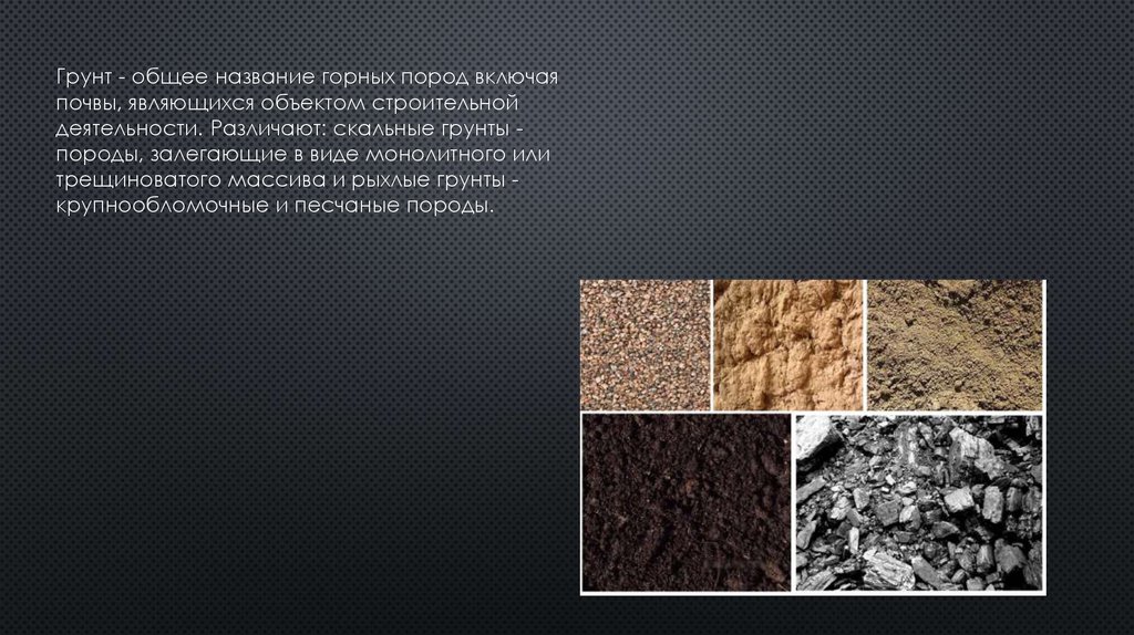 Грунт - общее название горных пород включаяпочвы, являющихся объектом строительной