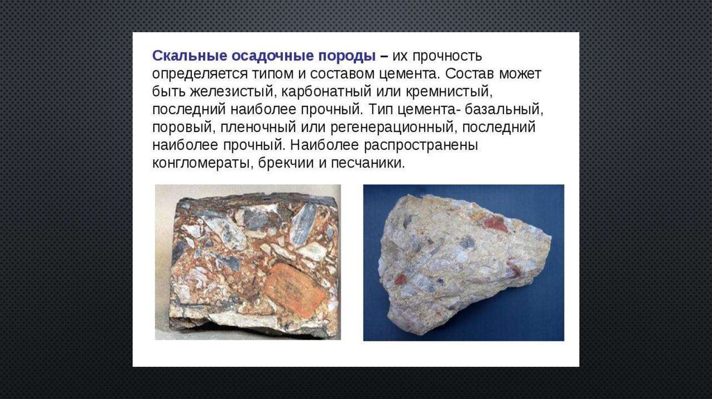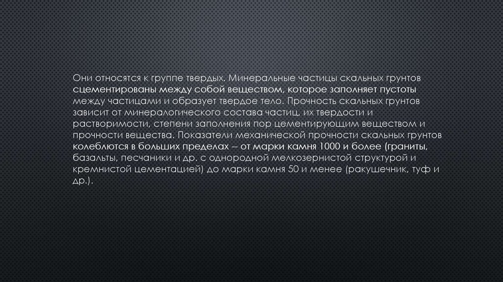 Они относятся к группе твердых. Минеральные частицы скальных грунтовсцементированы между собой веществом, которое заполняет пустоты
