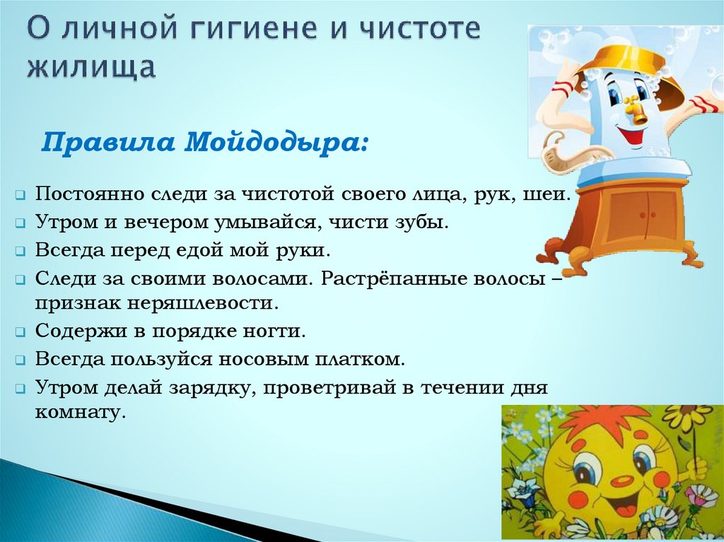 Правила Мойдодыра:Постоянно следи за чистотой своего лица, рук, шеи.