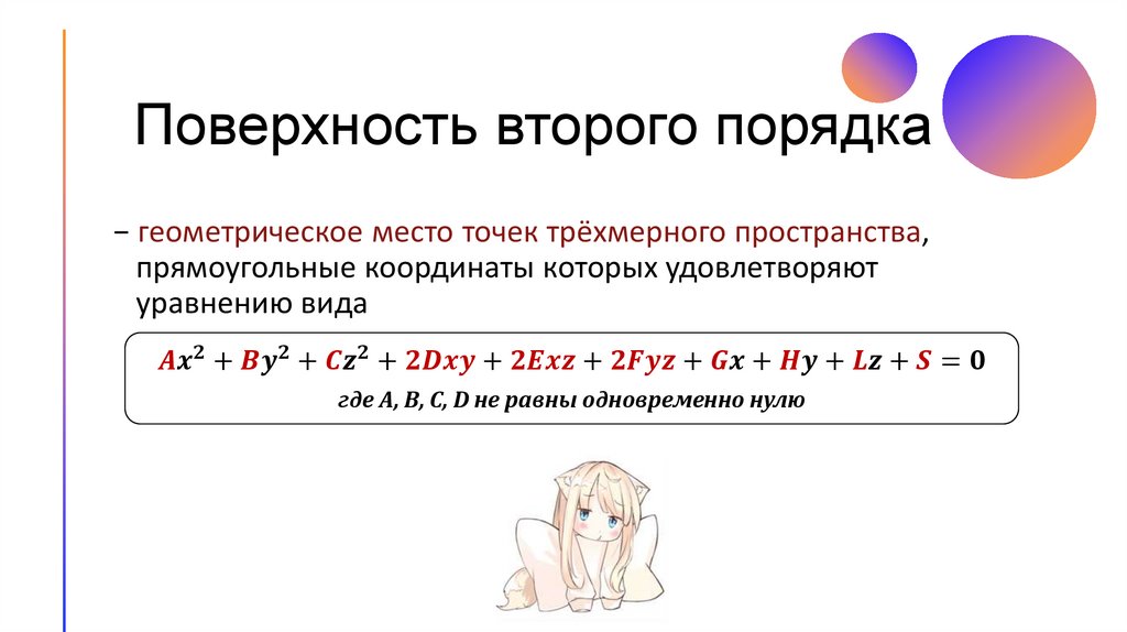 Поверхность второго порядка− геометрическое место точек трёхмерного пространства,