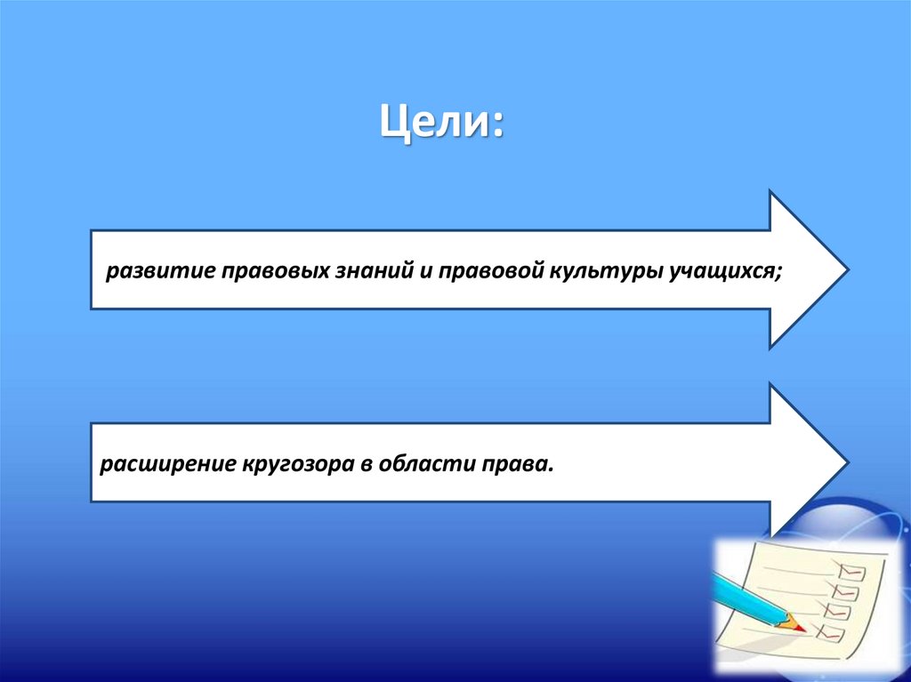 Цели:развитие правовых знаний и правовой культуры учащихся;