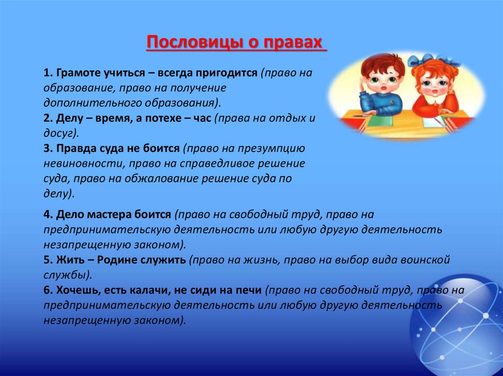 Пословицы о правах1. Грамоте учиться – всегда пригодится (право на