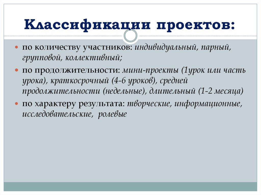 Классификации проектов:по количеству участников: индивидуальный, парный,