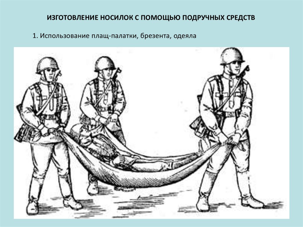 ИЗГОТОВЛЕНИЕ НОСИЛОК С ПОМОЩЬЮ ПОДРУЧНЫХ СРЕДСТВ1. Использование плащ-палатки, брезента, одеяла