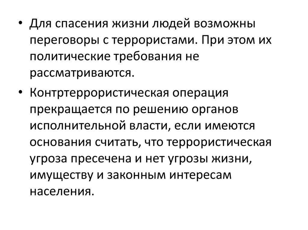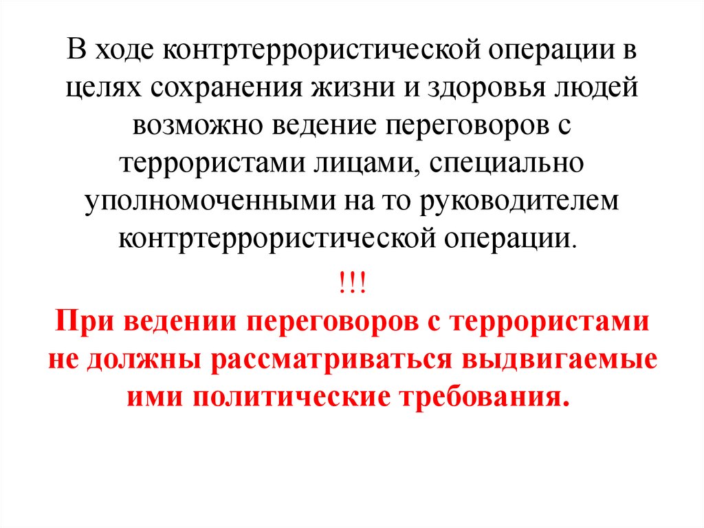 • Для спасения жизни людей возможныпереговоры с террористами. При этом их
