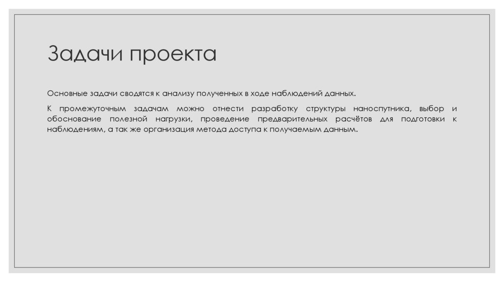 К промежуточным задачам можно отнести разработку структуры наноспутника, выбор и