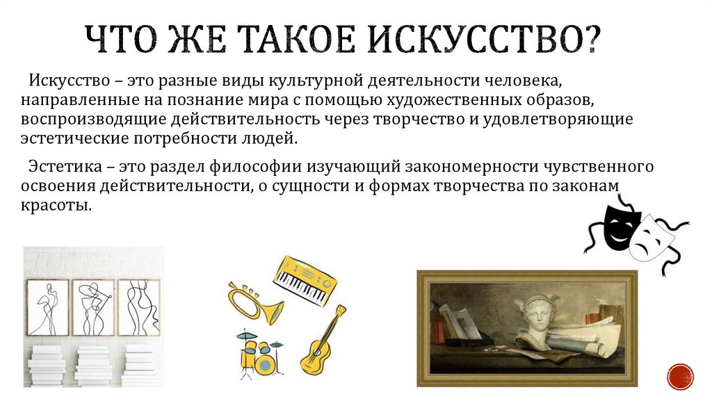 Искусство – это разные виды культурной деятельности человека,направленные на познание мира с помощью художественных образов,