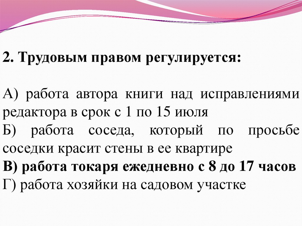 2. Трудовым правом регулируется:А) работа автора книги над исправлениями