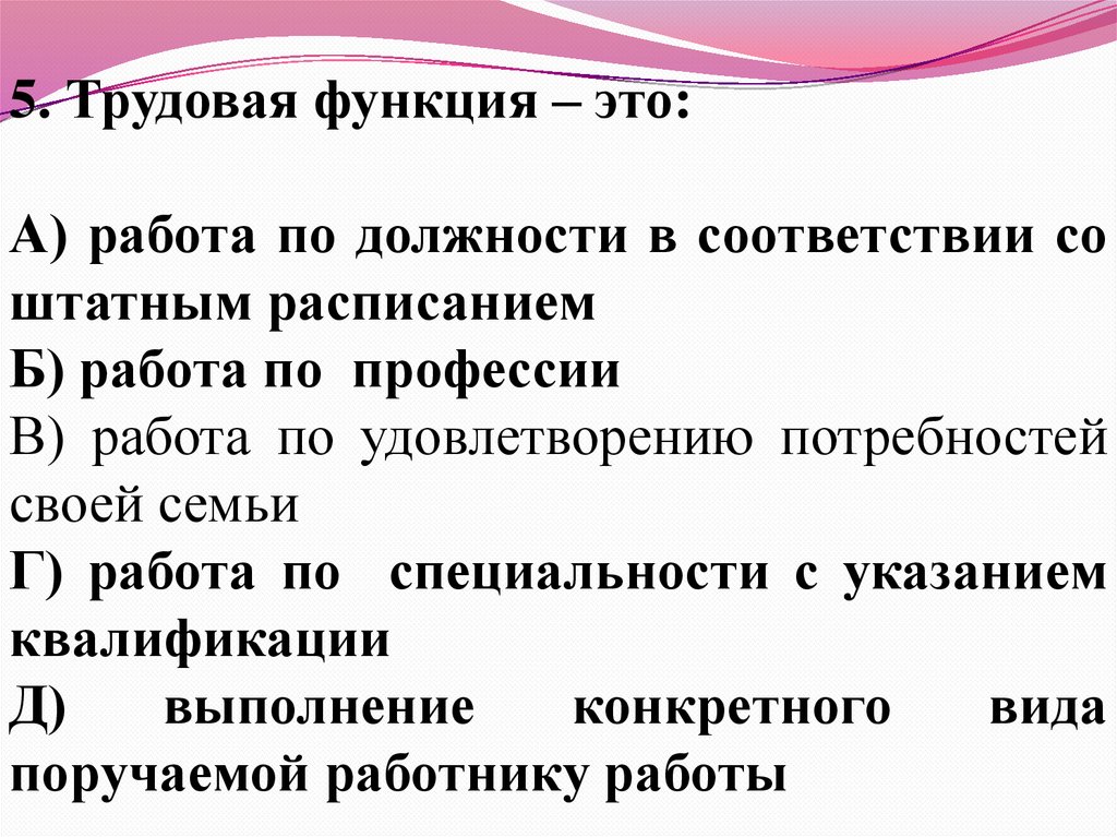 5. Трудовая функция – это:А) работа по должности в соответствии со
