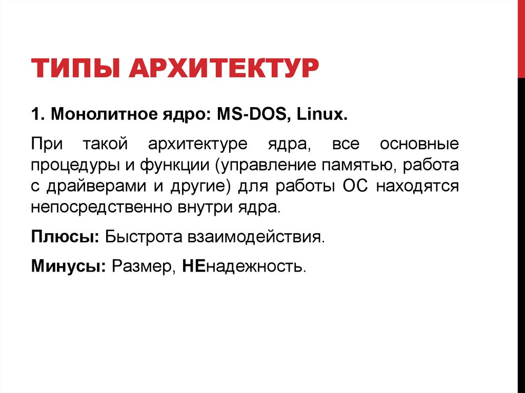ТИПЫ АРХИТЕКТУР1. Монолитное ядро: MS-DOS, Linux.