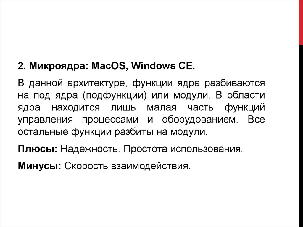 2. Микроядра: MacOS, Windows CE.В данной архитектуре, функции ядра разбиваются