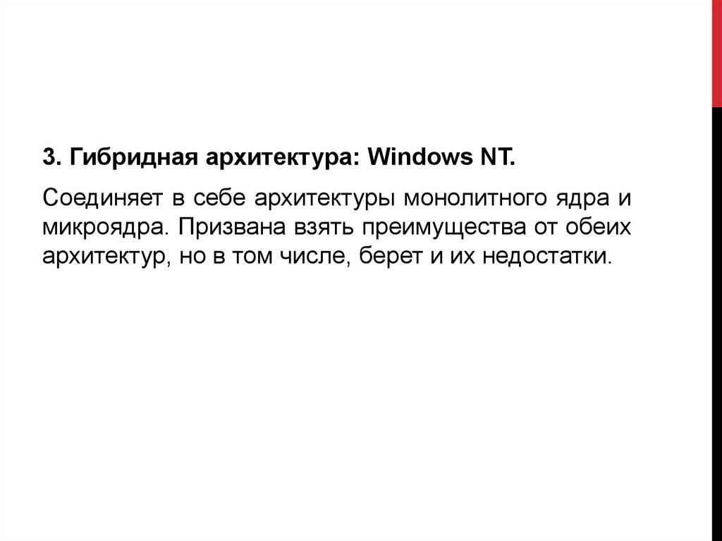 3. Гибридная архитектура: Windows NT.Соединяет в себе архитектуры монолитного ядра и
