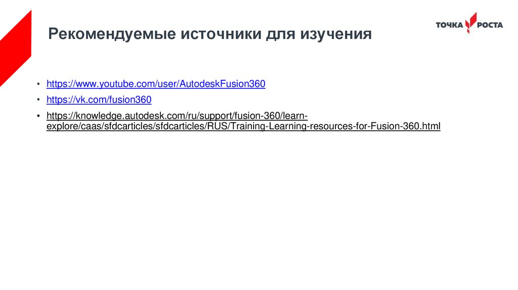 Рекомендуемые источники для изучения• https://www.youtube.com/user/AutodeskFusion360
