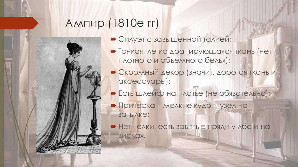 Ампир (1810е гг)Силуэт с завышенной талией;