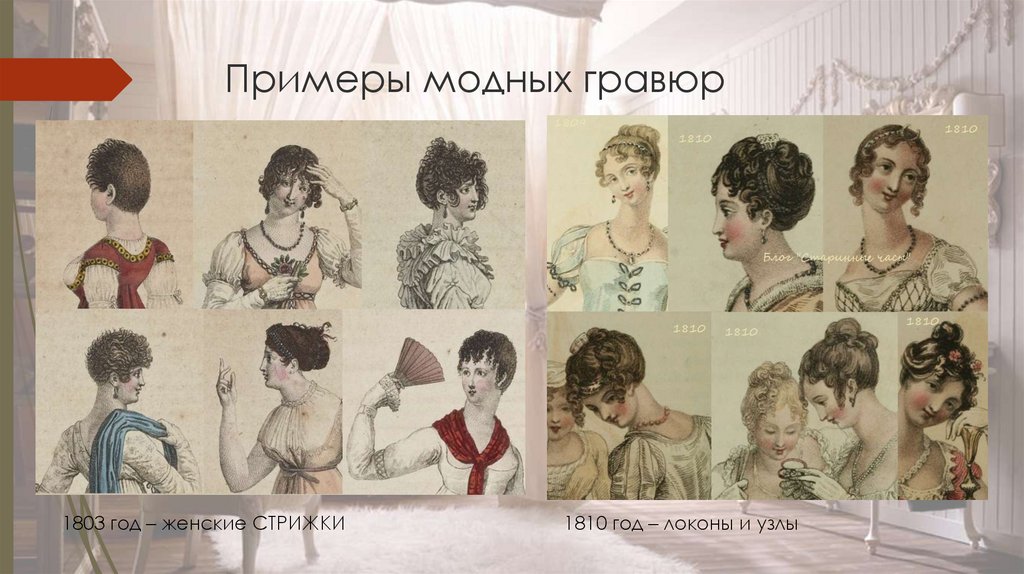 Примеры модных гравюр1803 год – женские СТРИЖКИ