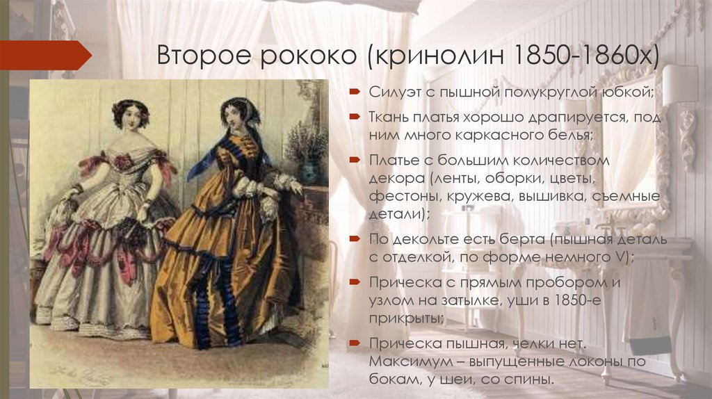 Второе рококо (кринолин 1850-1860х)Силуэт с пышной полукруглой юбкой;