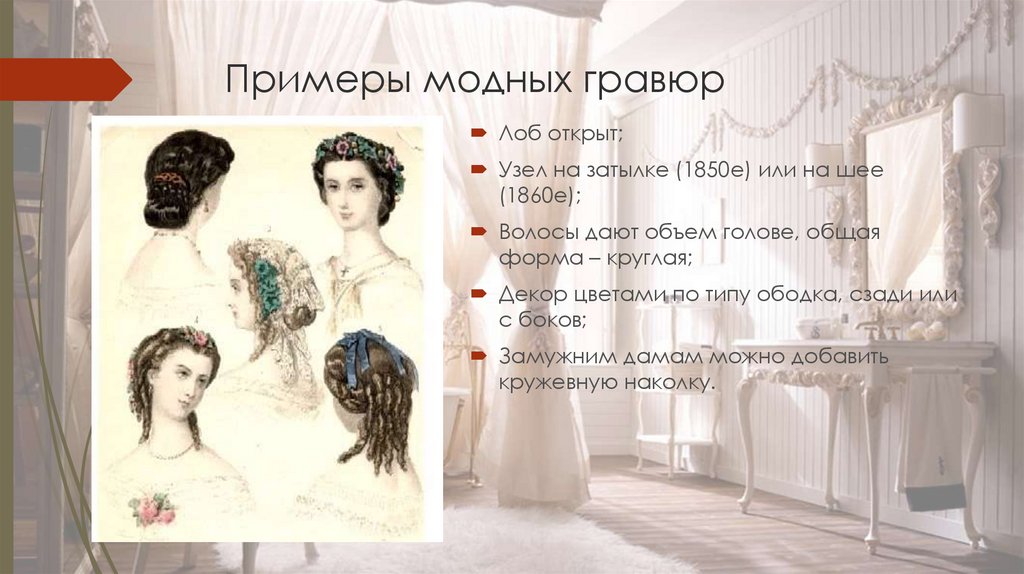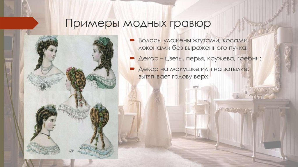 Примеры модных гравюрВолосы уложены жгутами, косами,