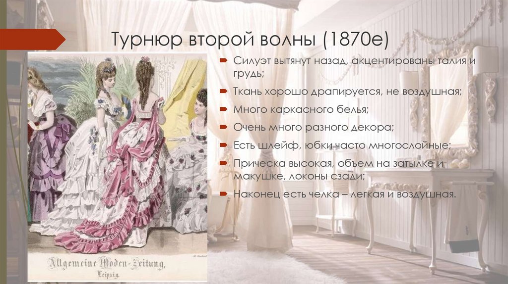 Турнюр второй волны (1870е)Силуэт вытянут назад, акцентированы талия и