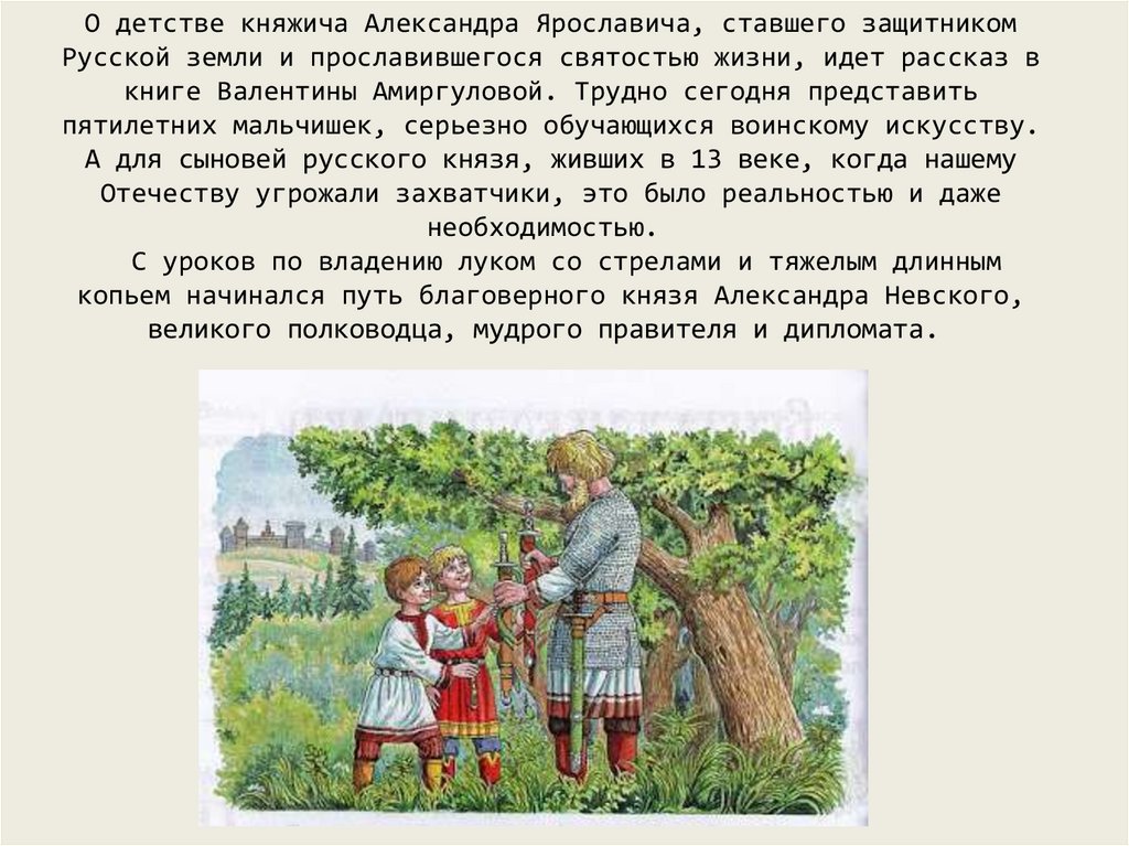 О детстве княжича Александра Ярославича, ставшего защитникомРусской земли и прославившегося святостью жизни, идет рассказ в