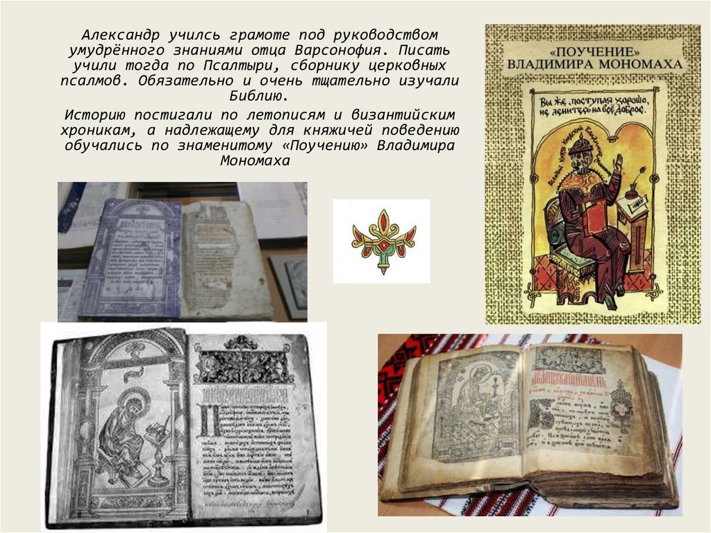 Александр училсь грамоте под руководствомумудрённого знаниями отца Варсонофия. Писать
