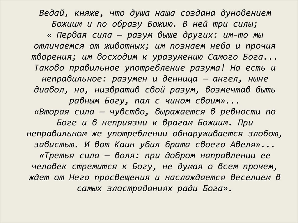 Ведай, княже, что душа наша создана дуновениемБожиим и по образу Божию. В ней три силы;