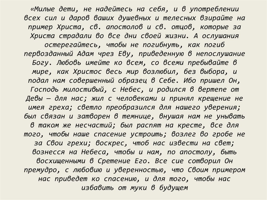 «Милые дети, не надейтесь на себя, и в употреблениивсех сил и даров ваших душевных и телесных взирайте на
