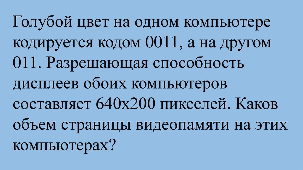 Голубой цвет на одном компьютерекодируется кодом 0011, а на другом