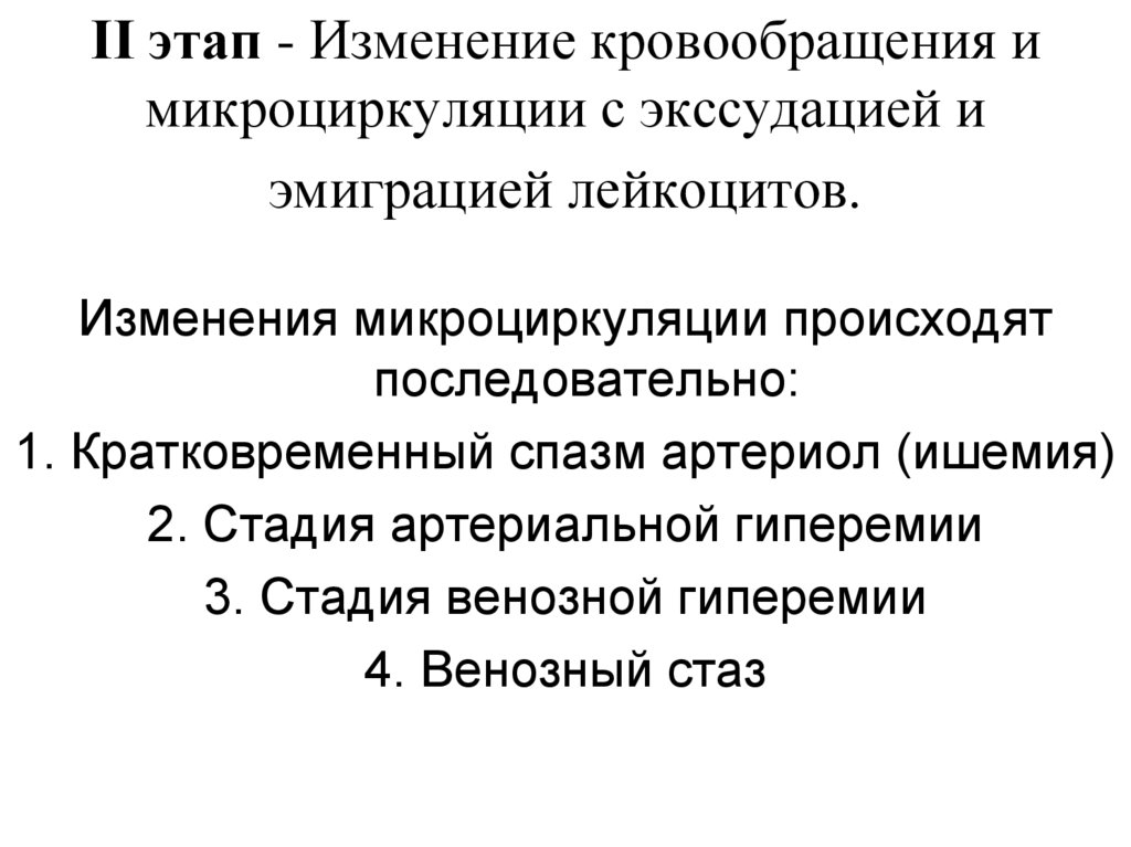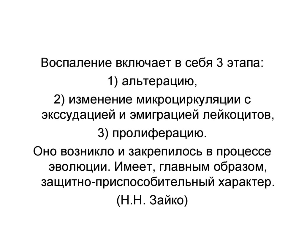 Воспаление включает в себя 3 этапа:1) альтерацию,