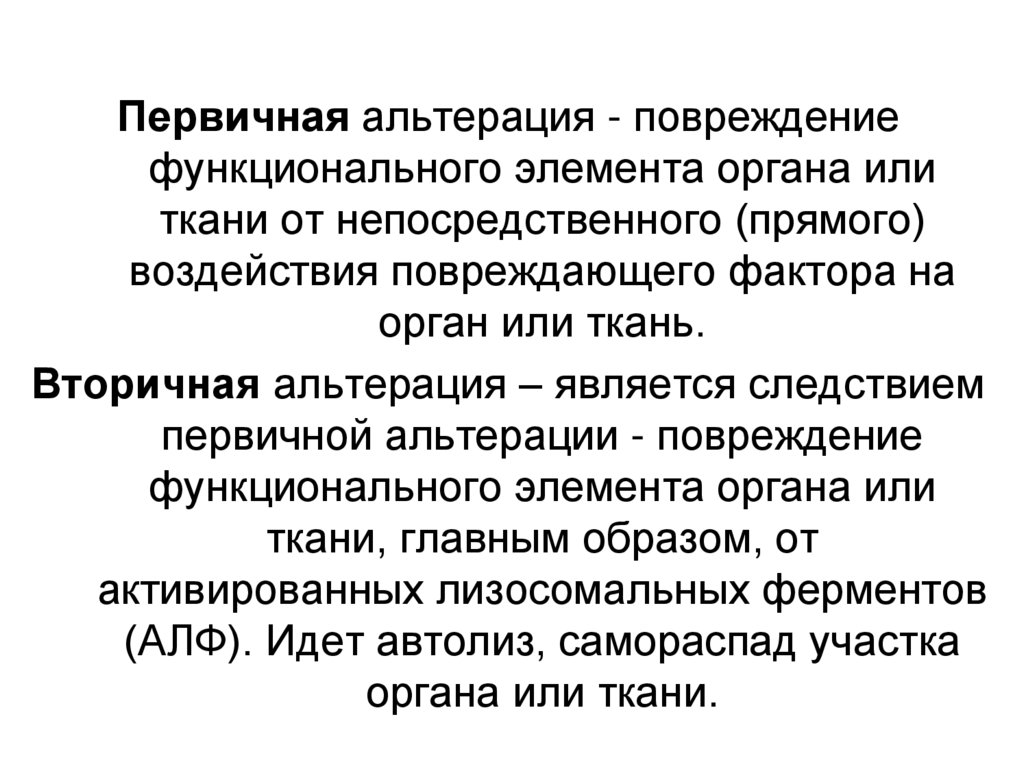 Первичная альтерация - повреждениефункционального элемента органа или