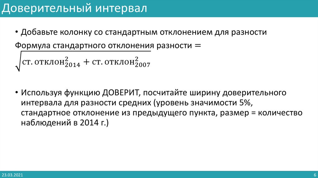 • Используя функцию ДОВЕРИТ, посчитайте ширину доверительного